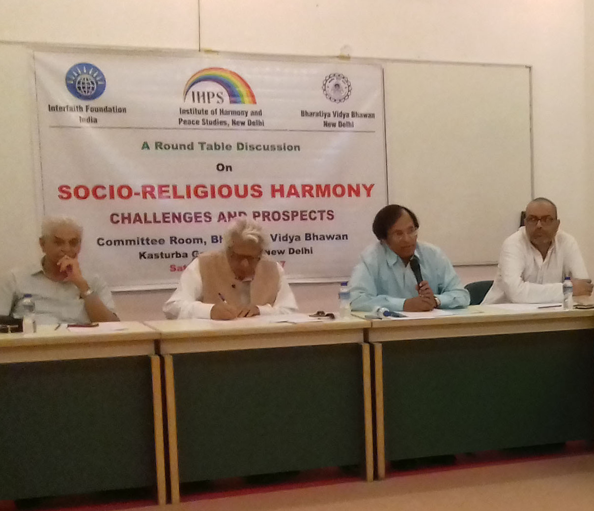 Institute of Harmony and Peace Studies, New Delhi, in collaboration with Interfaith Foundation India, New Delhi, and Bharatiya Vidya Bhawan, New Delhi, organized a Round Table Discussion at Bharatiya Vidya Bhawan, New Delhi, on 20 May 2017. The Theme of the discussion was 'Socio-religious Harmony: Challenges and Prospects'.